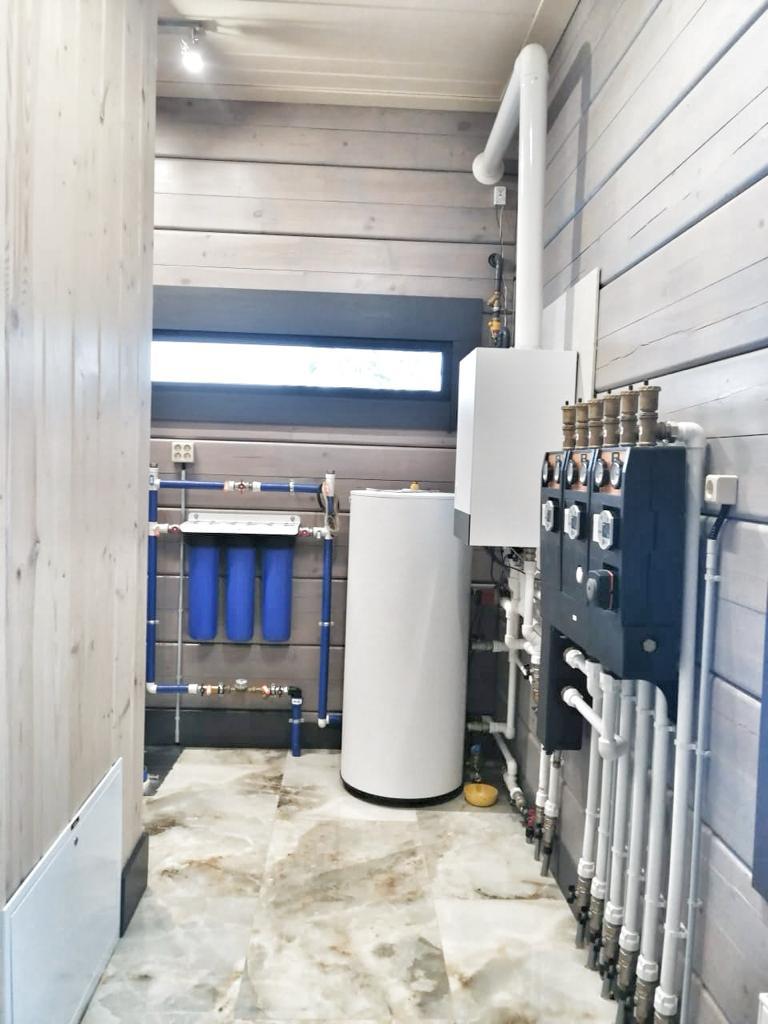 Коммуникации: магистральный газ, скважина, центральная канализация, теплые полы. Инженерия: электрика Legrand, автоматика ABB, газовый котел Viessmann. Электричество 15 кВт.