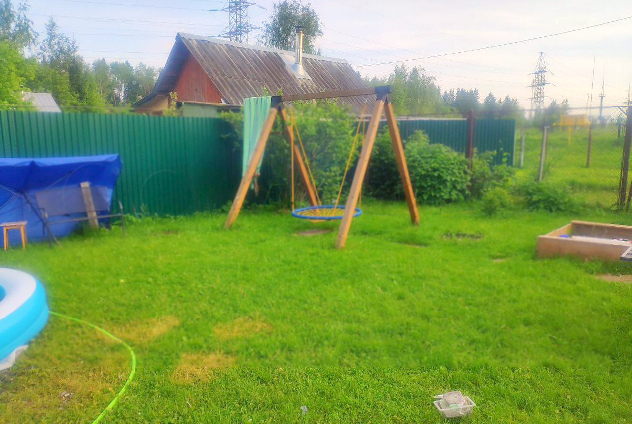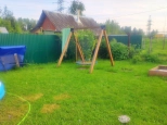 Участок 7 соток. Залито место под 2 машины и бетонные дорожки по участку, стоят большие качели - гнездо. Плодовые деревья и кустарники: груши, яблони, слива, смородина, малина, ежевика.