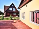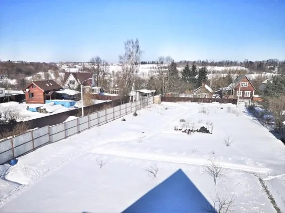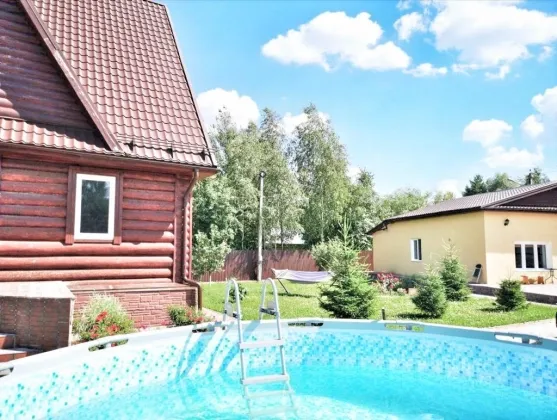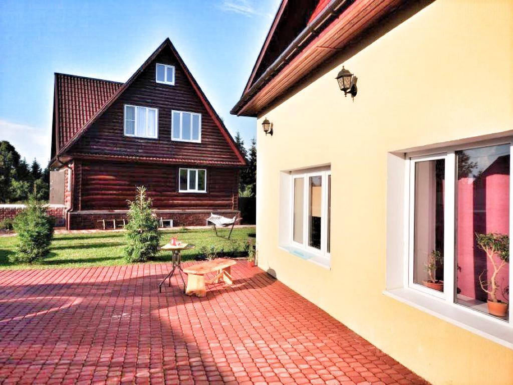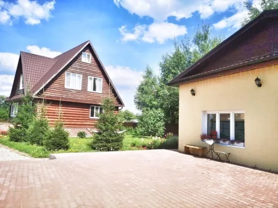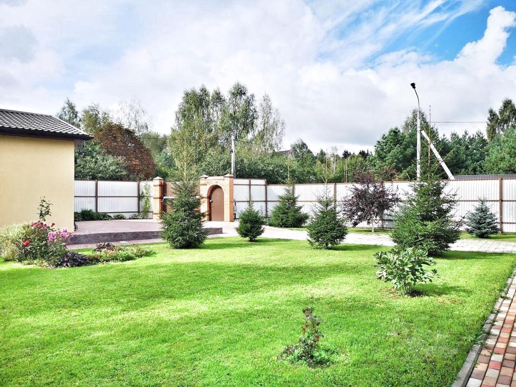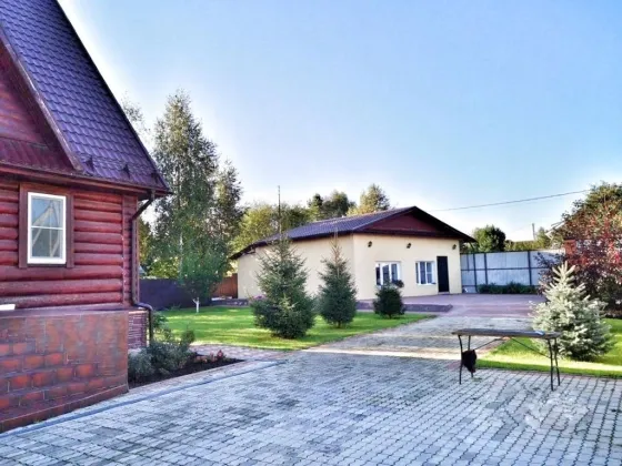 Участок 20 соток под ИЖС. По периметру металлический забор; площадки и дорожки, выложенные брусчаткой и плиткой; большая часть - газоны/лужайки, 7-летние деревья (груши, яблони) и кустарники (смородина, крыжовник, жимолость); розы; есть фундамент под баню 4х3м. На участке есть гостевой дом (100 кв. м, 1 этаж, пеноблоки, отдельный септик, отопление - электричество и камин): кухня-гостиная с камином; 1 спальня, 1 санузел, кладовая. В деревне постоянно живут соседи.