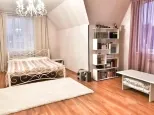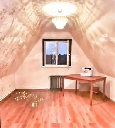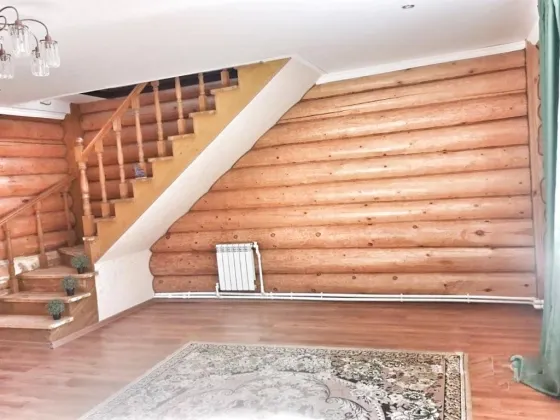 1 этаж: прихожая, санузел, гостиная с деревянной лестницей на 2ой этаж, кухня; материалы: бревенчатые стены, пол - ламинат.