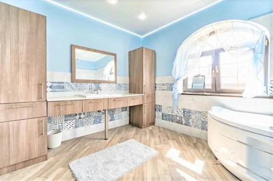 В доме 4 спальни, одна на 1 этаже, объединенная кухня гостиная, мансардный этаж (который может использоваться как жилое помещение).