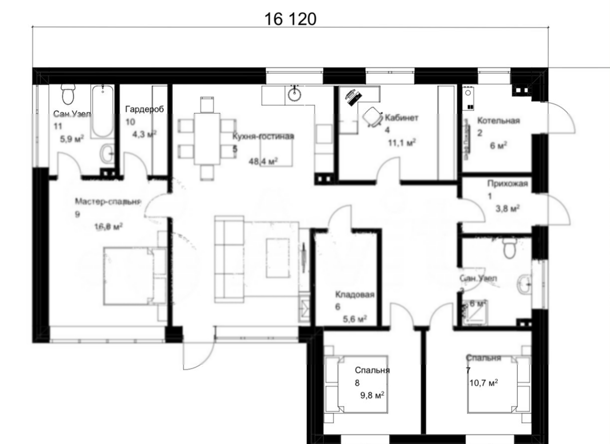 Большая кухня-гостиная с выходом на террасу, кабинет, 3 спальни, 2 санузла, гардеробная, кладовая, тех. помещение с отдельным входом, где установлен электрический котел, с возможностью установки газового котла.