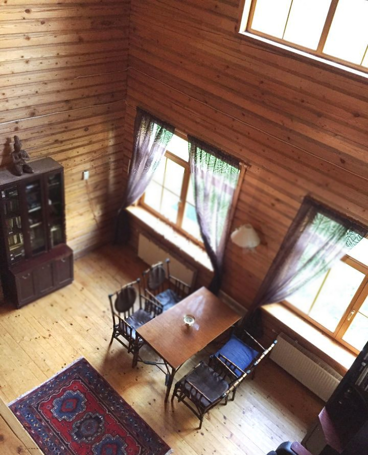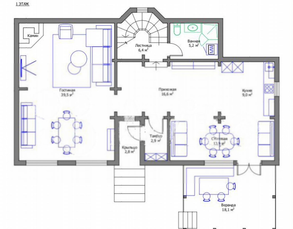 1 этаж: кухня-столовая, прихожая, санузел с ванной, тамбур, гостиная с камином и вторым светом, веранда.