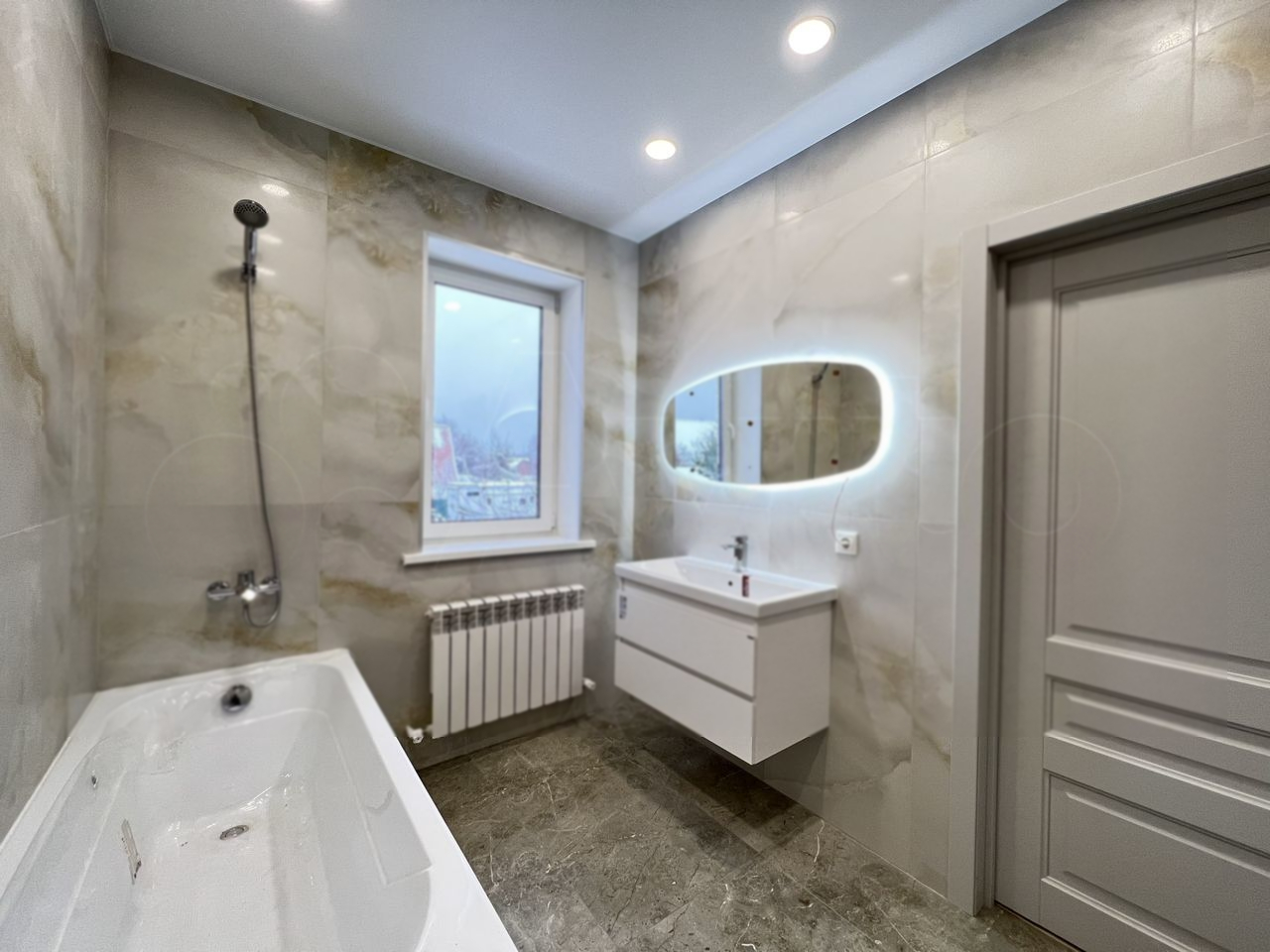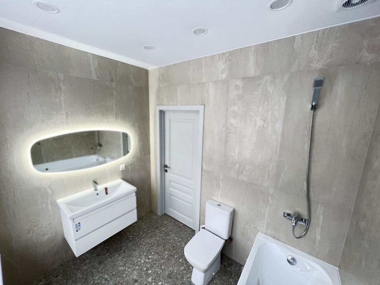 Большая кухня-столовая с выходом на террасу. 4 спальни с гардеробными, в том числе на 1 этаже и тремя санузлами.