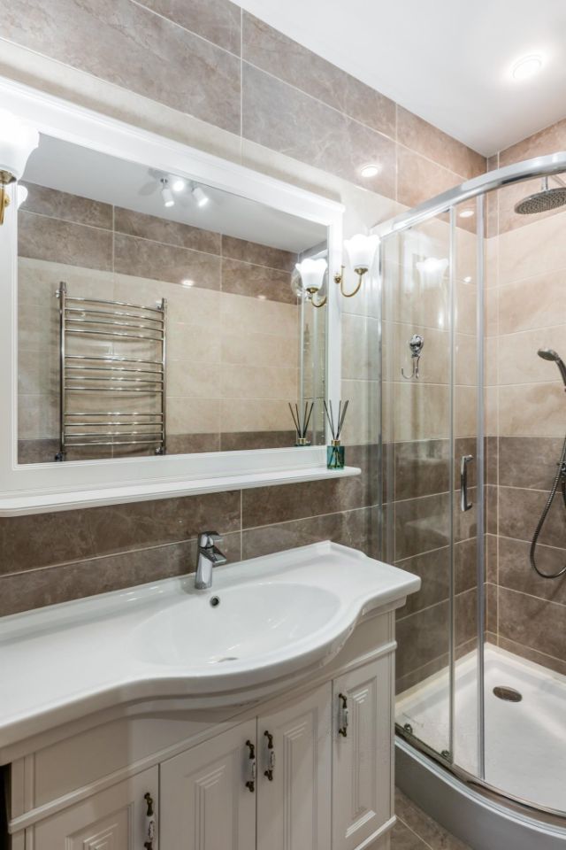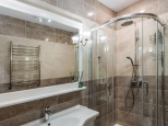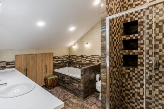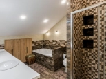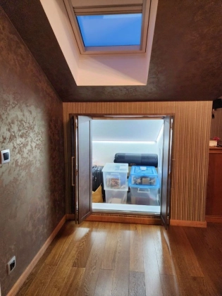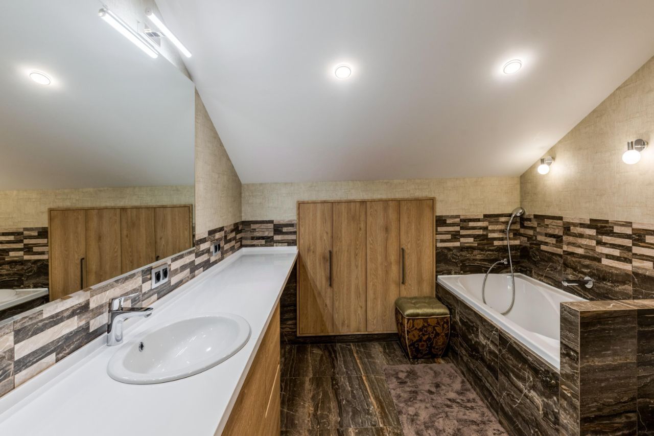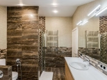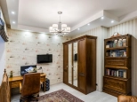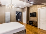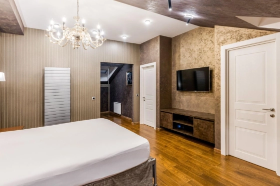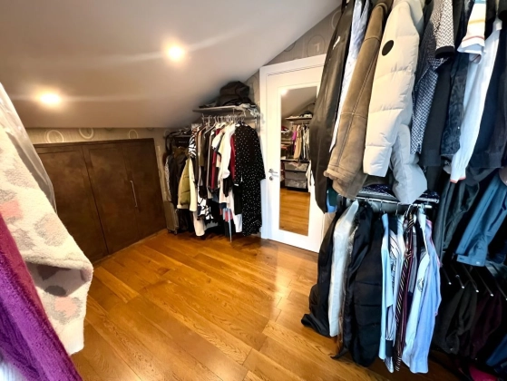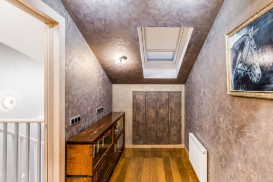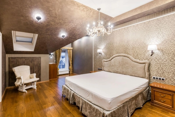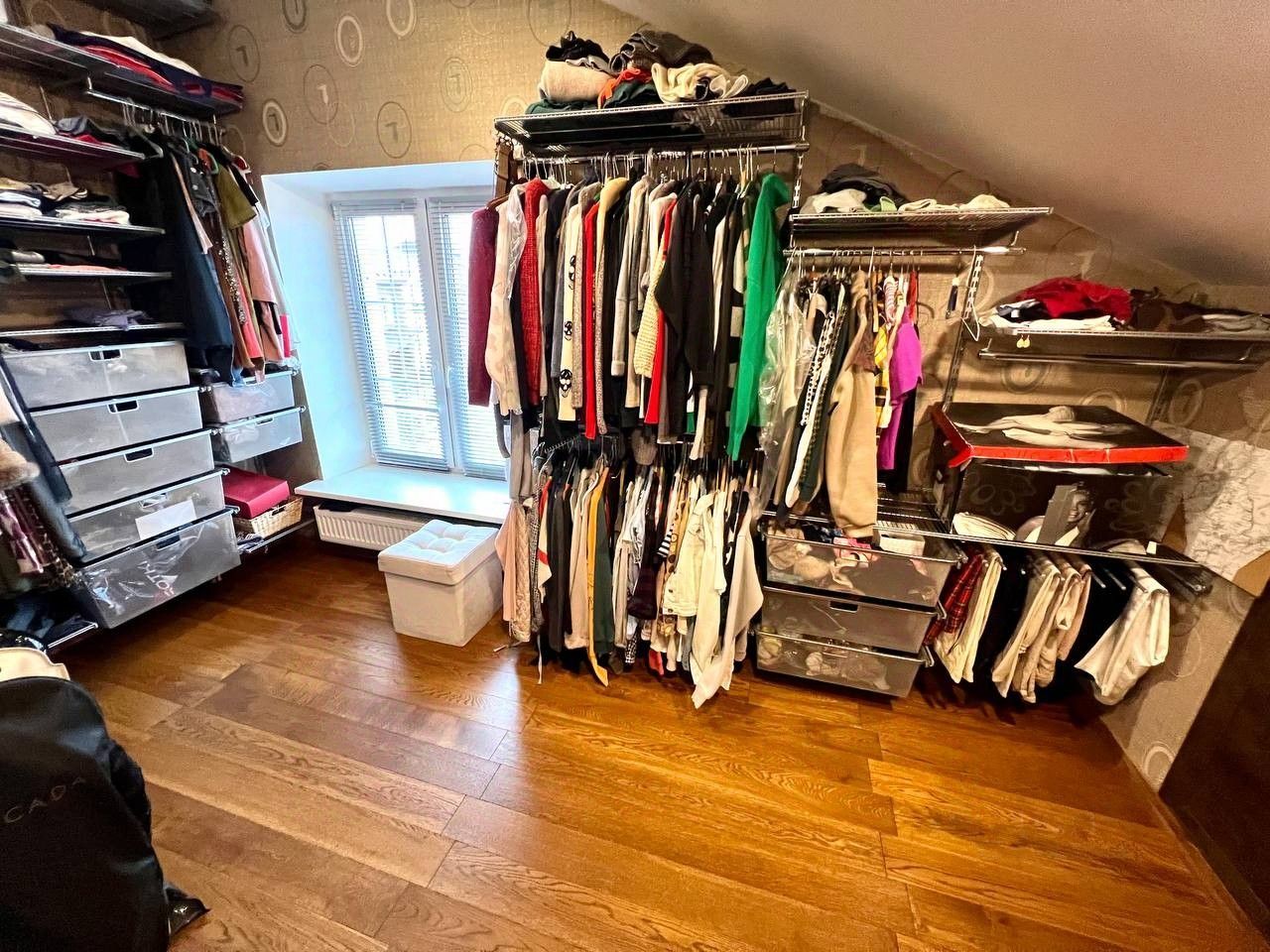 3 этаж: мастер спальня, большая гардеробная, санузел с ванной и душевой кабиной, теплым полом (подготовка под 2ю стиральную машину), просторные ниши хранения под скатами крыши, 2 мансардных окна. Материалы: паркетная доска, декоративная штукатурка, обои Trussardi.