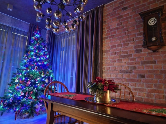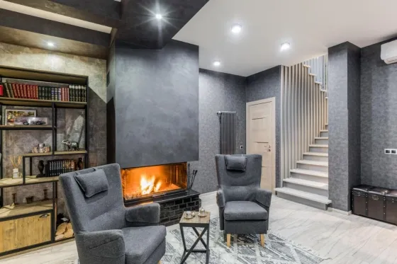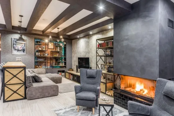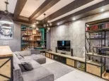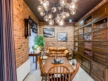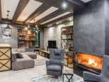 1 этаж: зона прихожей (большой встроенный шкаф), кухня-гостиная с барной стойкой (дуб), столовая-библиотека (Bjorkvist), каминная зона, с/у, постирочная с зоной хранения Elfa, выход на задний двор, котельная. Материалы: испанская плитка, декоративная штукатурка, заказная мебель, заказной декоративный отделочный кирпич по слепкам материалов царской эпохи.