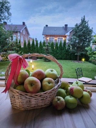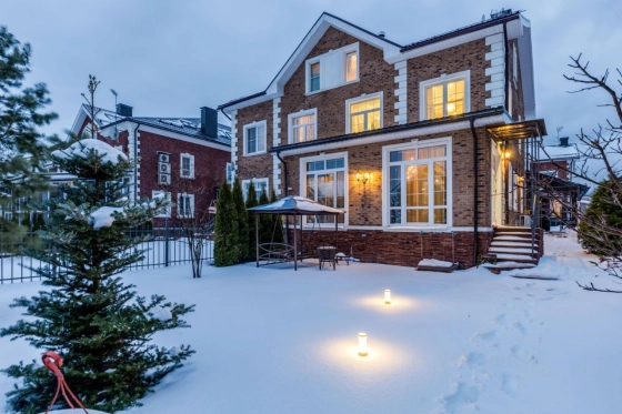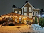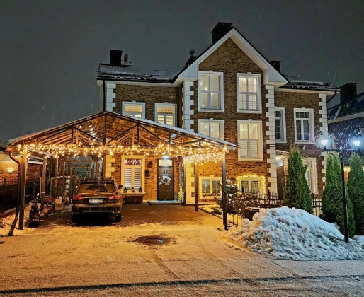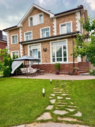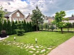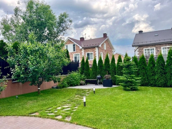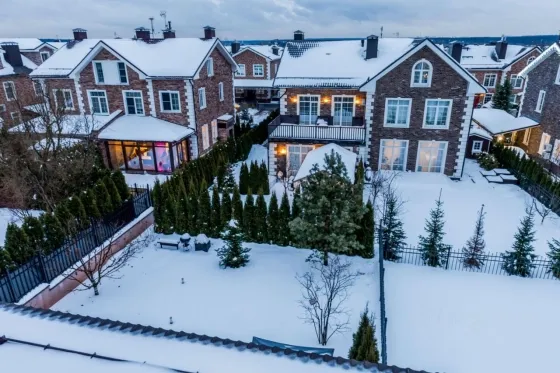 Участок 4,2 сотки. Территория поселка охраняется, имеются 2 КПП, гостевые парковки, ландшафтное озеленение общих территорий, теннисный корт, баскетбольная площадка, 6 детских площадок, зоны для прогулок и отдыха. Ежедневный вывоз мусора от домовладения. У поселка самая низкая среди схожих стоимость проживания, примерно эквивалент московской трешке. На участке газон, туи по периметру от соседей, большая яблоня, вишня, ягодные кусты, сосна, амурская сирень, зона декоративных растений и пр. Устроена система полива (дождеватели и капельный) с датчиком погоды. Организована зона барбекю и подсветка участка. Имеется хозблок для инвентаря. По периметру, в зонах отдыха и на парковке уложен клинкерный кирпич. Перед домом устроен большой навес для автомобилей. Поселок огорожен, охраняется, въезд через 2 КПП.