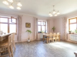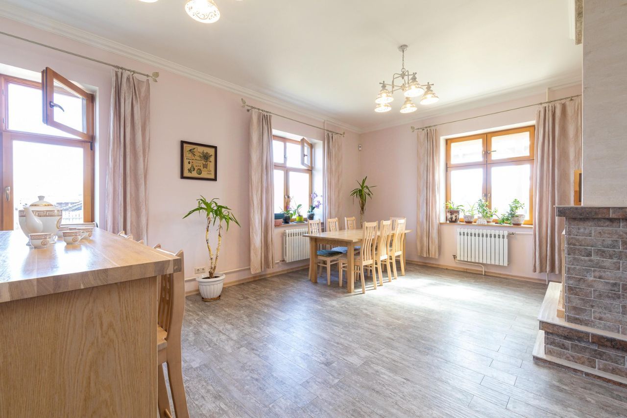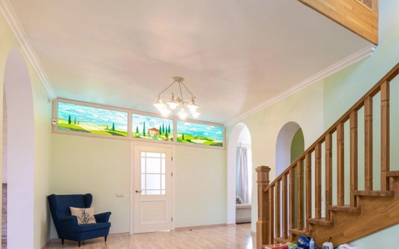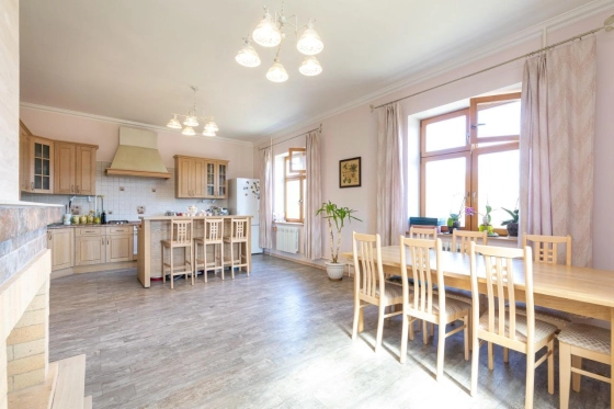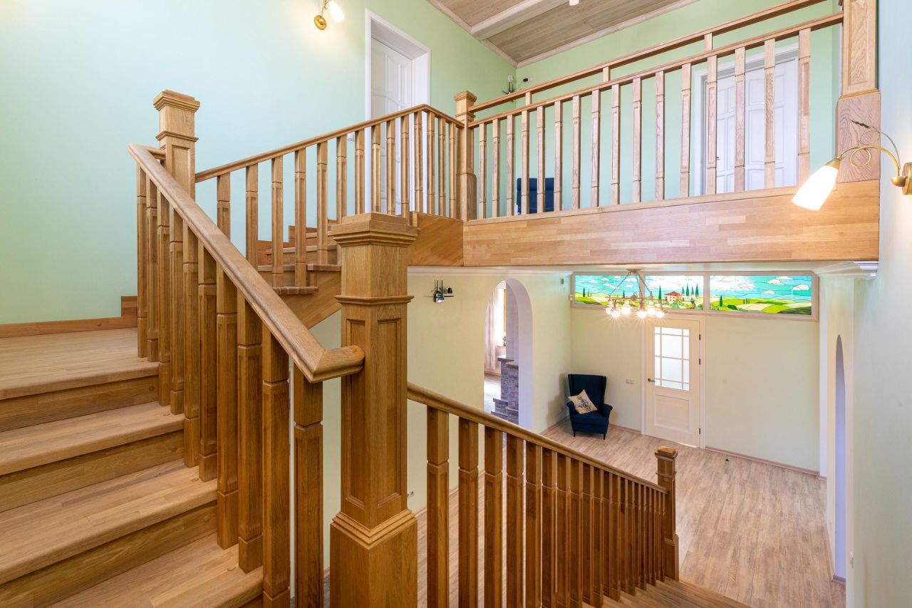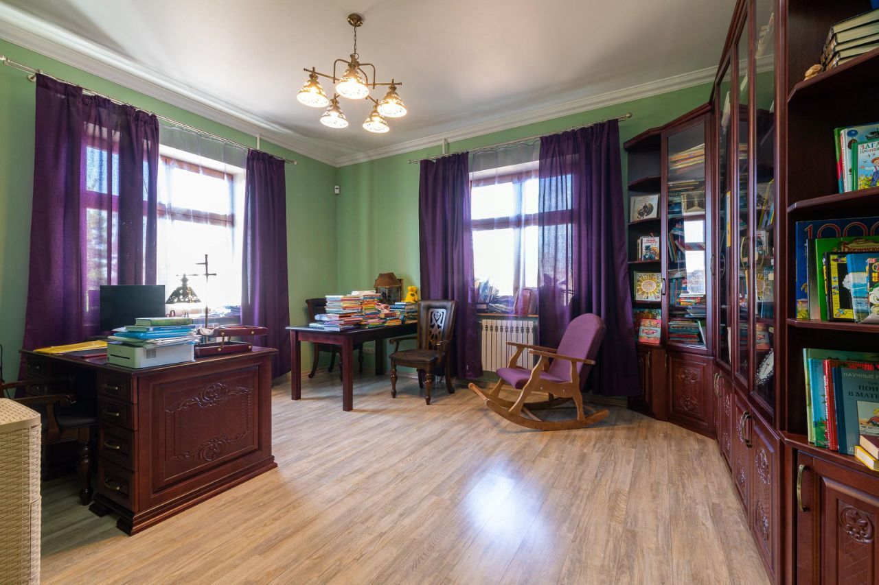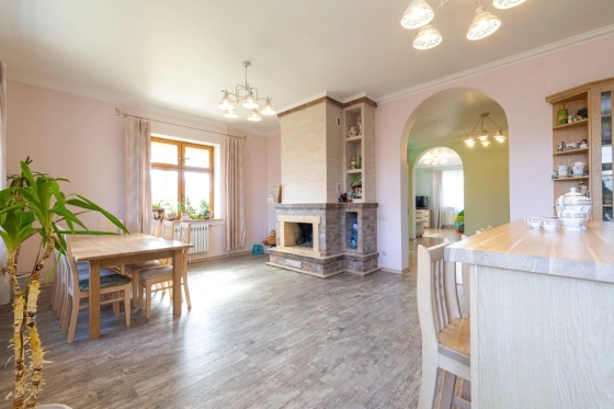 1 этаж: просторный холл с аркой в комнату и аркой в столовую, кухня-столовая с камином и обеденной зоной, кабинет-библиотека с резной мебелью, гардероб, санузел.