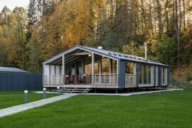 Дом по проекту Кедр компании ДубльДом. 1 этаж. Площадь дома – 65 м², общая площадь застройки – 102.8 м². Натуральные и экологически чистые материалы. Снаружи дом отделан деревом и профлистом цвета серый графит. Внутренняя отделка –массив дерева. Утепление 200 мм в полу и 150 мм в стенах и крыше. Межкомнатные двери массив, окна двухкамерные стеклопакеты в деревянных рамах, панорамное остекление по боковому фасаду. Дом сдаётся полностью готовый к проживанию, оборудованный сантехникой, установленным бойлером, вентиляционным клапаном, камином с комплектом дымохода, со всеми заведёнными в дом и подключёнными коммуникациями.