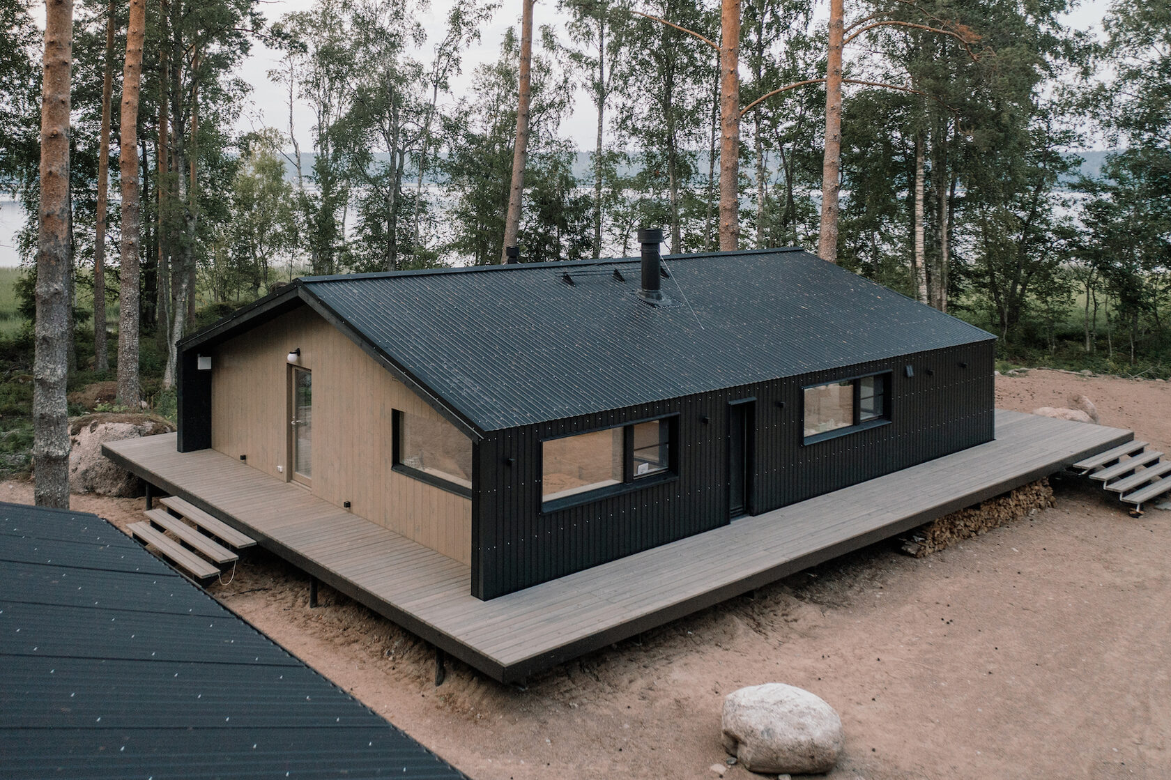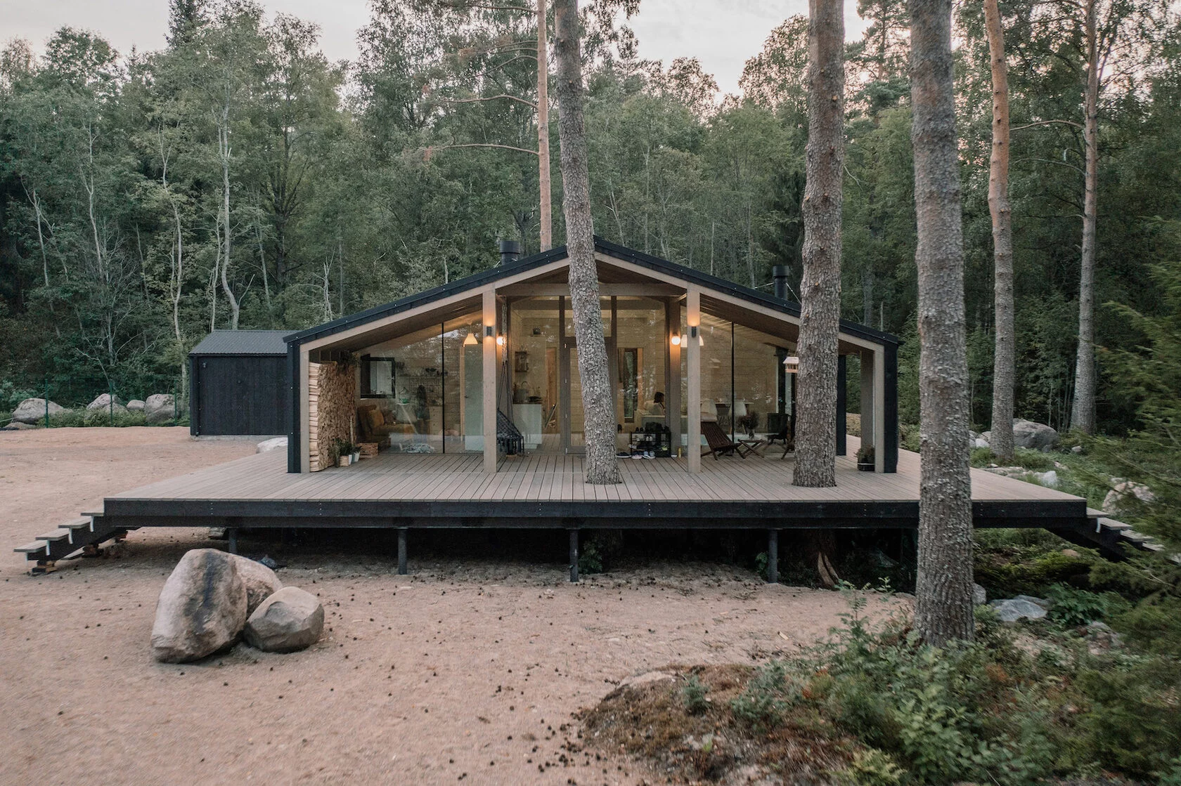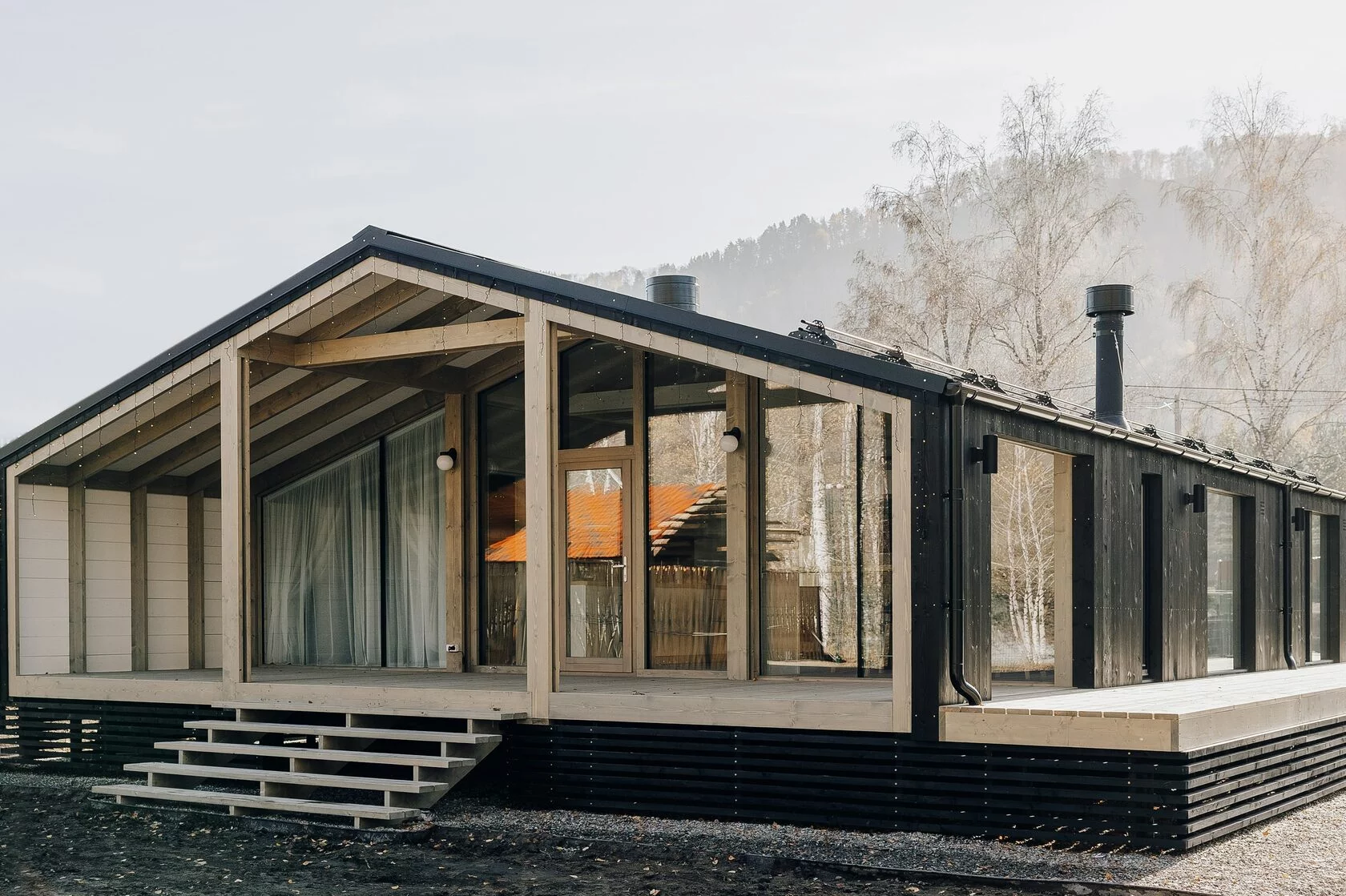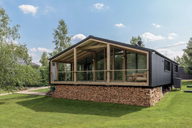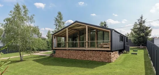Дом по проекту Кедр компании ДубльДом. 1 этаж. Площадь дома – 65 м², общая площадь застройки – 102.8 м². Натуральные и экологически чистые материалы. Снаружи дом отделан деревом и профлистом цвета серый графит. Внутренняя отделка –массив дерева. Утепление 200 мм в полу и 150 мм в стенах и крыше. Межкомнатные двери массив, окна двухкамерные стеклопакеты в деревянных рамах, панорамное остекление по боковому фасаду. Дом сдаётся полностью готовый к проживанию, оборудованный сантехникой, установленным бойлером, вентиляционным клапаном, камином с комплектом дымохода, со всеми заведёнными в дом и подключёнными коммуникациями.