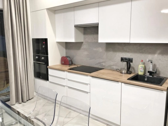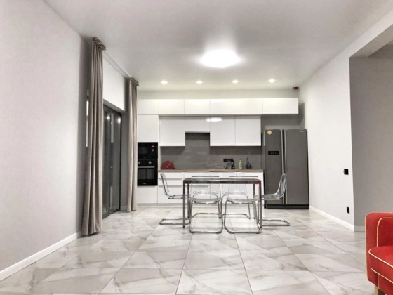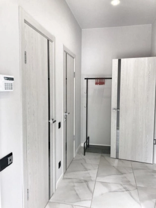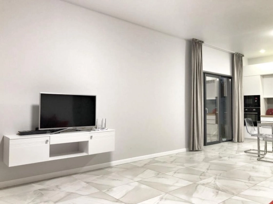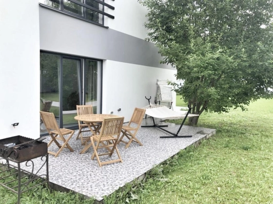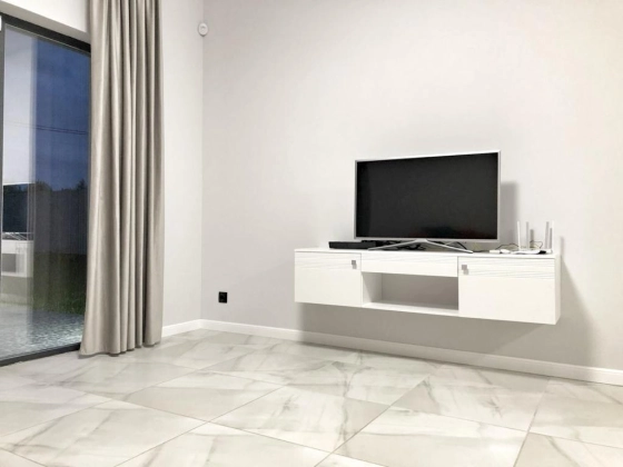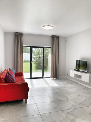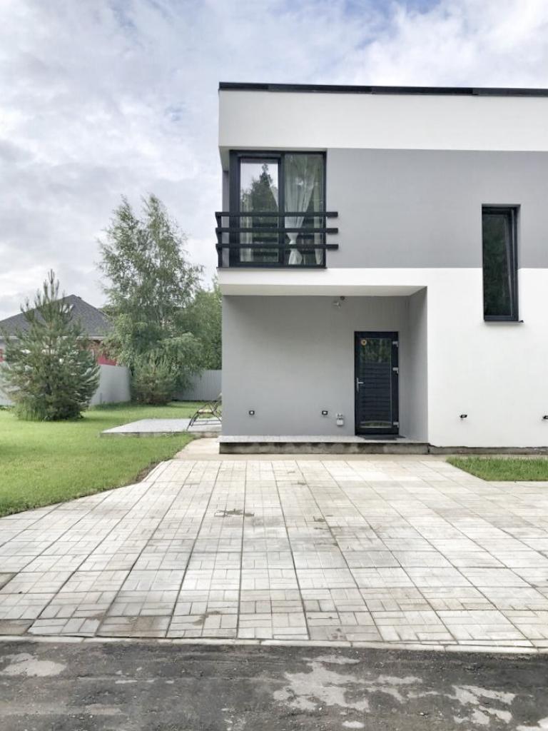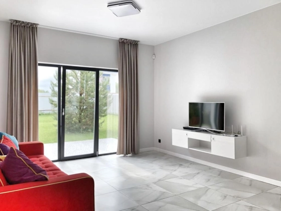 1 этаж: просторная кухня-гостиная с выходом на патио и на участок, гостевая спальня, с/у, техпомещение (бойлерная-прачечная), кладовка под лестничным маршем). Высота потолков 3 м.