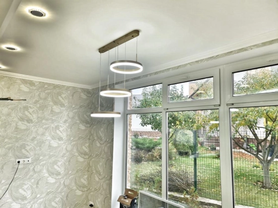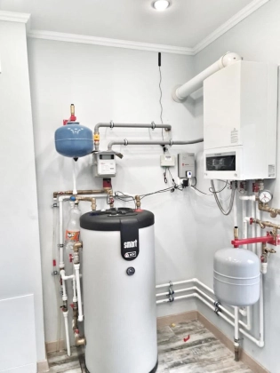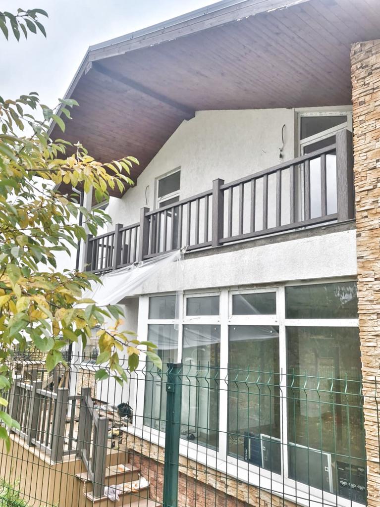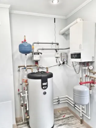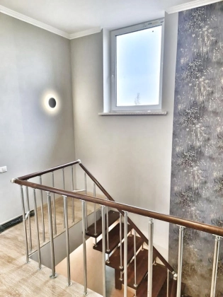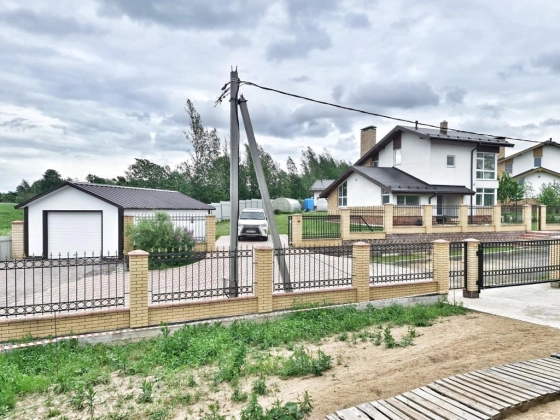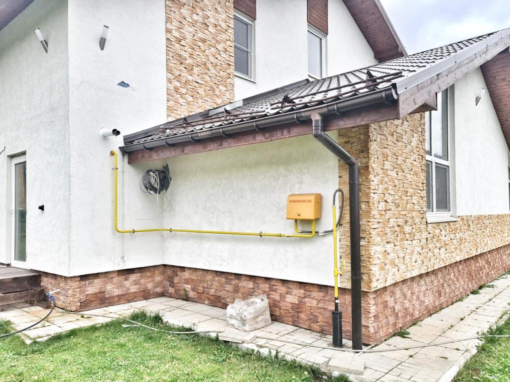 Коммуникации: электричество 16 кВт, газ магистральный, вода скважина, канализация септик, заложены магистрали для кондиционеров, сделан выход под камин в гостиной. Интернет оптоволокно по границе участка.