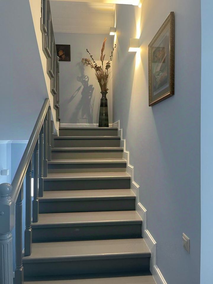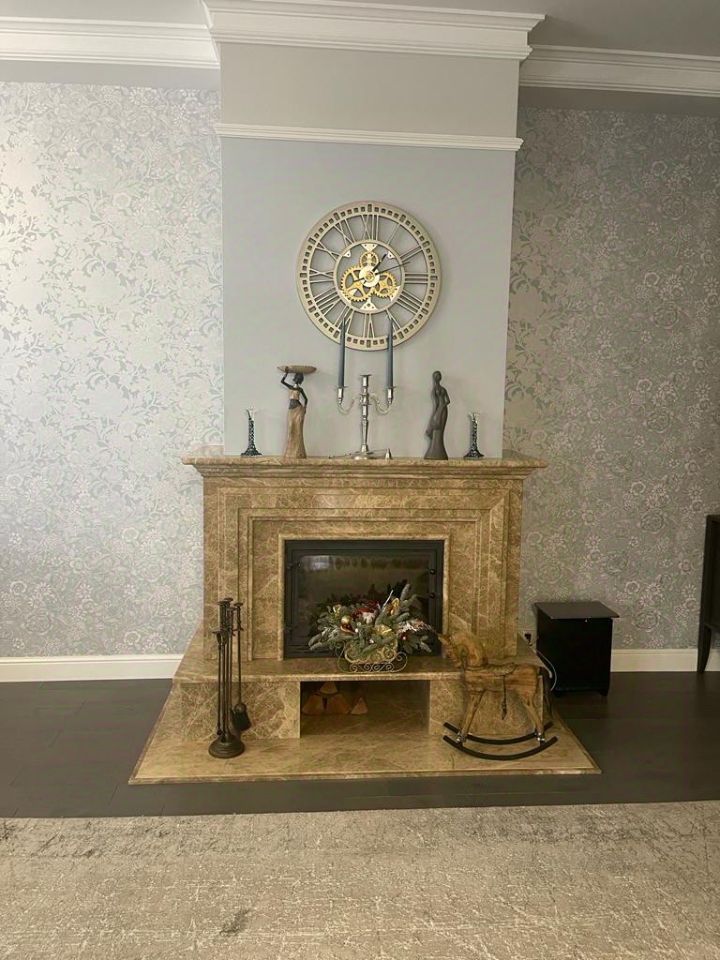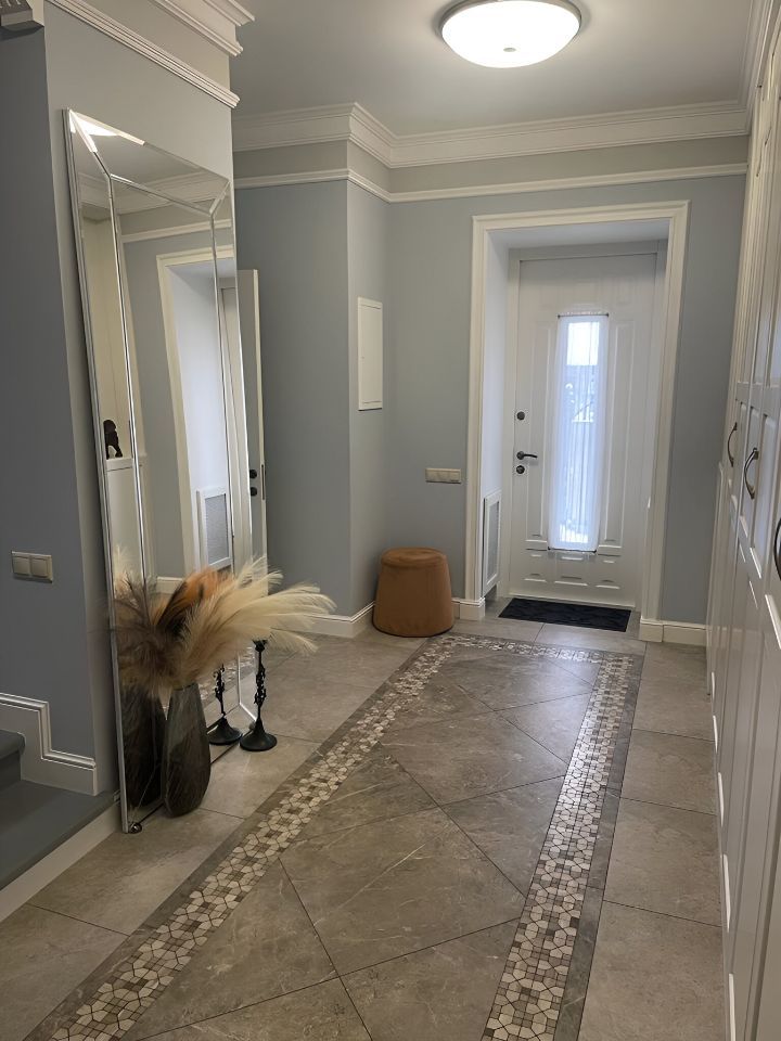 1 этаж: бойлерная с выходом в гараж, уютная и стильная гостиная с кухней-столовой, прихожая, холл, гардеробная, санузел с душевой, каминная зона с действующим дровяным камином (облицовка камина - мрамор), выходом на террасу и в прекрасно устроенный сад с беседкой-барбекю.