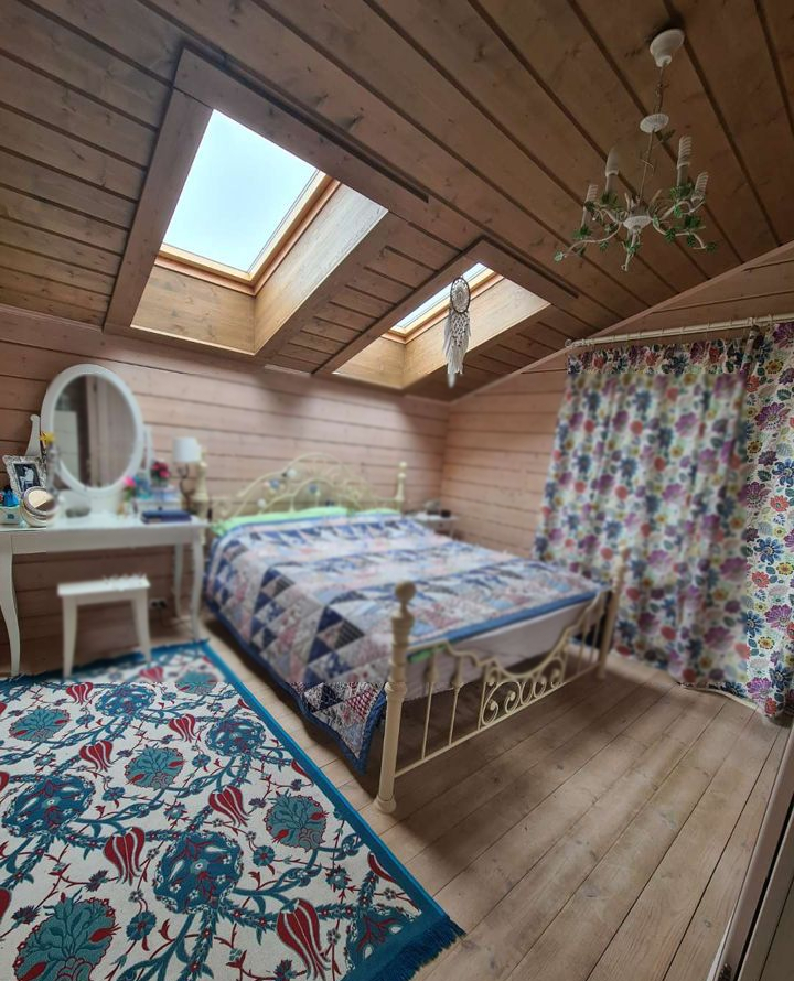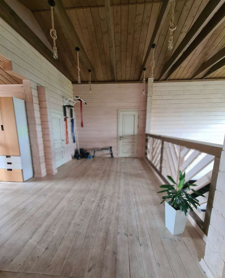2 этаж: холл для занятий спортом, 3 спальни, гардеробная, санузел с ванной.