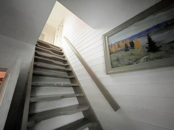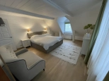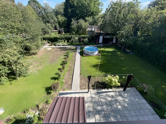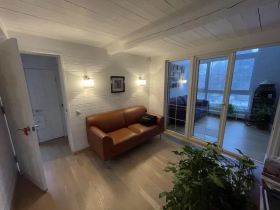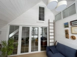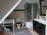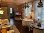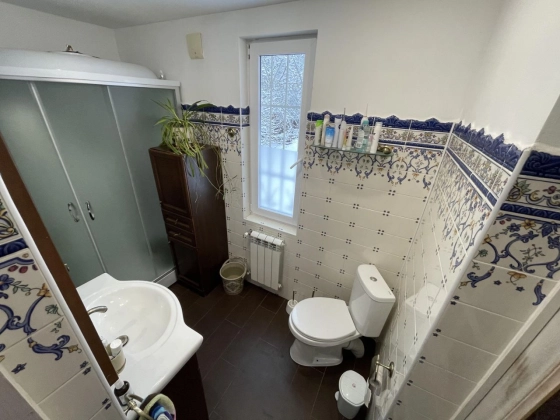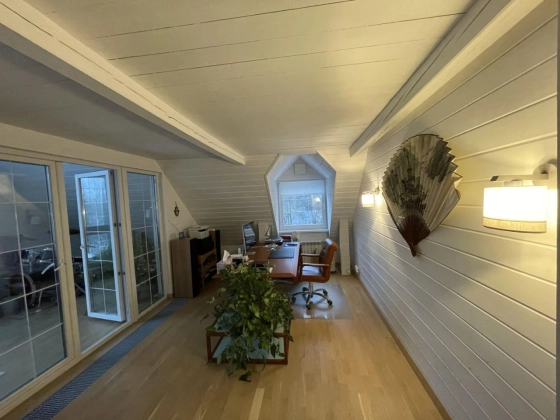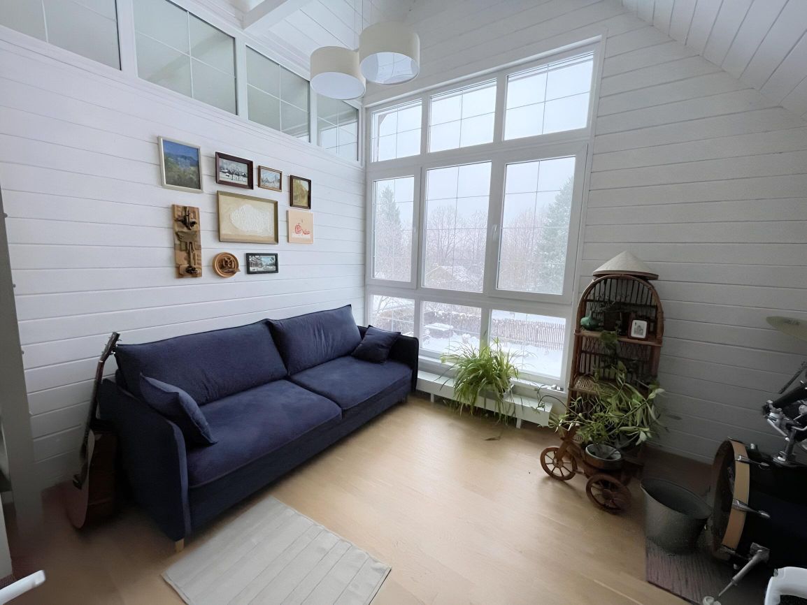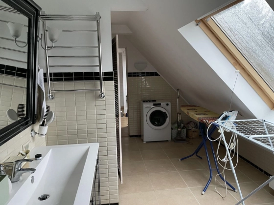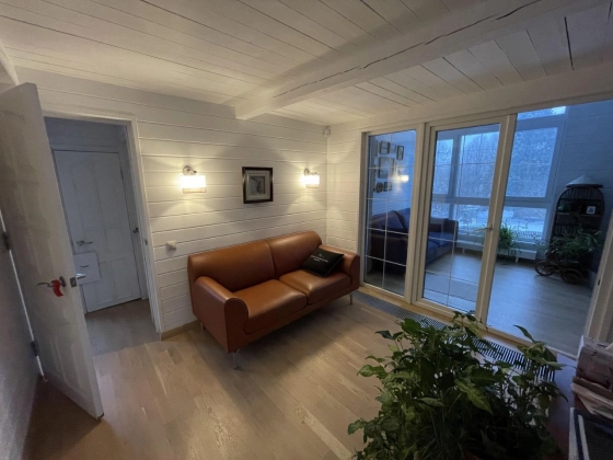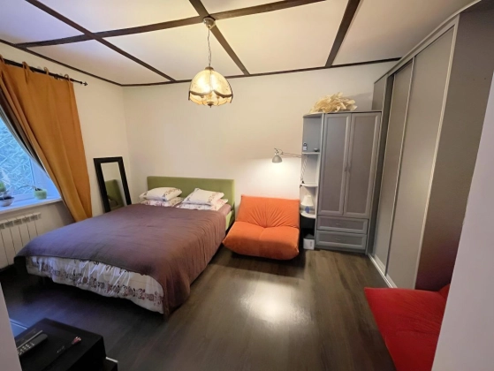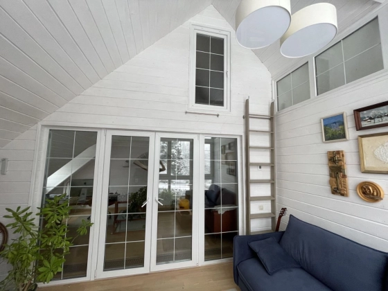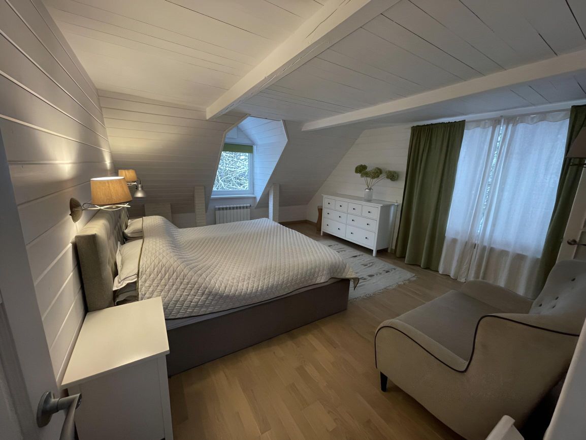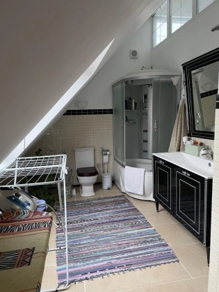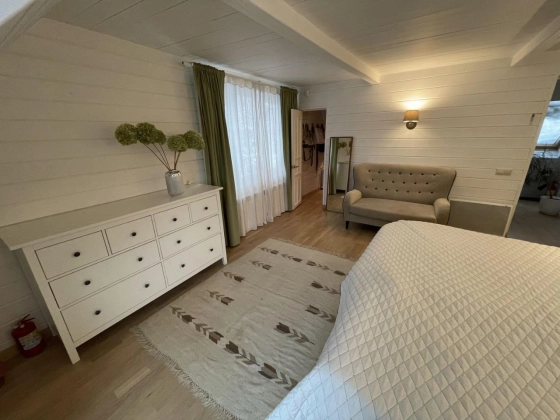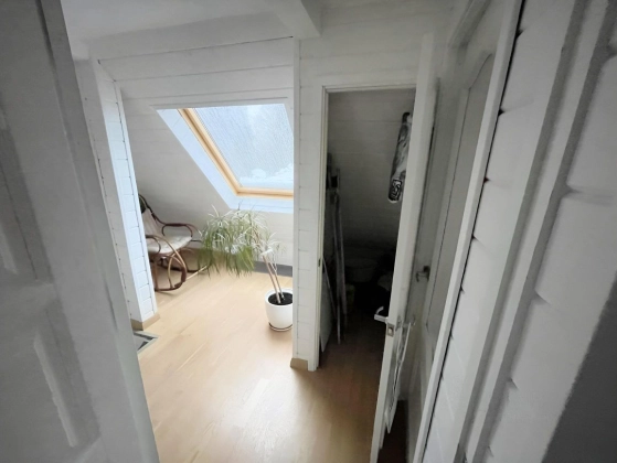 2 этаж: спальня с walk-in гардеробом, техническая подсобка в коридоре, санузел, рабочий кабинет и тёплая терраса, используемая как гостевая спальня, с доступом в большой чулан под крышей (3й этаж), где зимой температура не держится ниже 10 градусов.