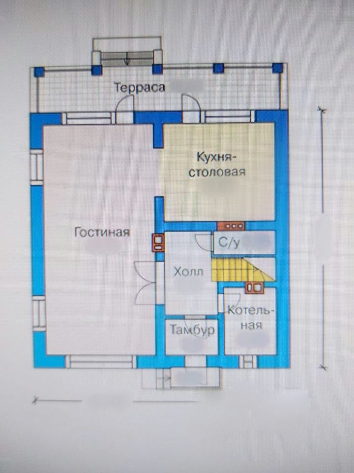 1 этаж: гостиная, кухня-столовая, холл, тамбур, котельная, санузел, терраса.