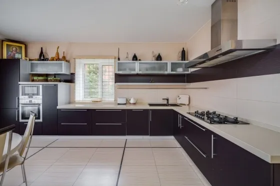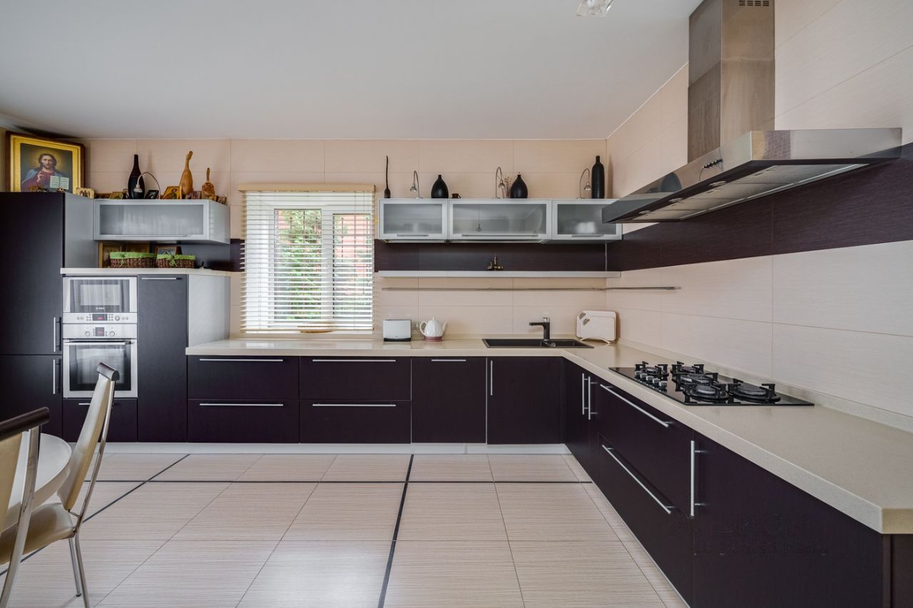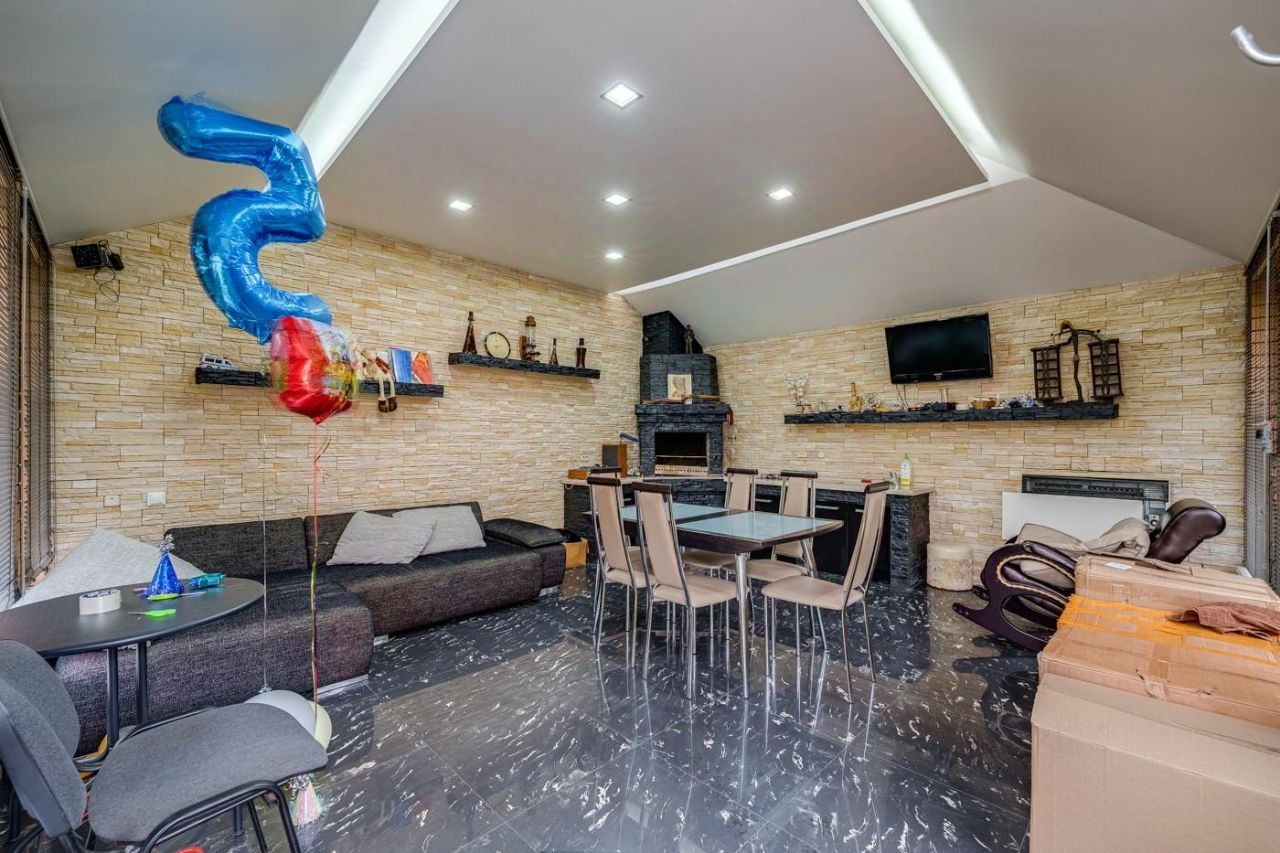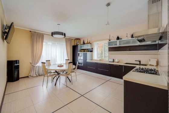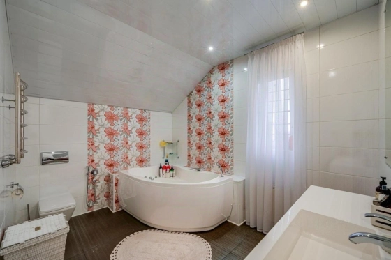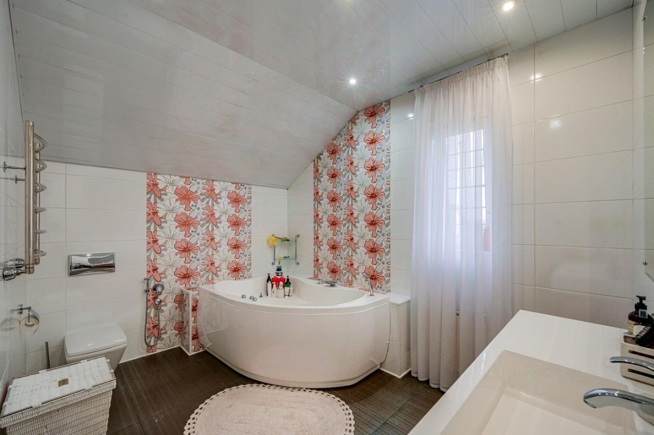 Коммуникации: газ магистральный, электричество 15 кВт, вода и канализация городские. Теплые полы на 1 этаже (где плитка), в цоколе и в с/у второго этажа. Дом поставлен на вневедомственную охрану.