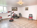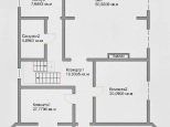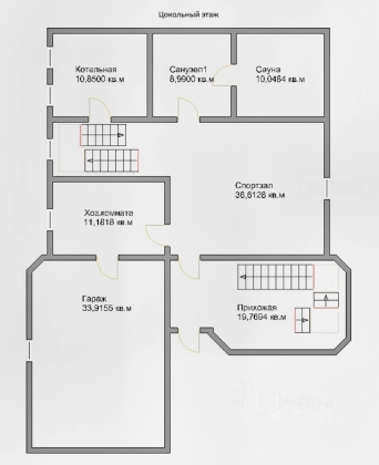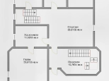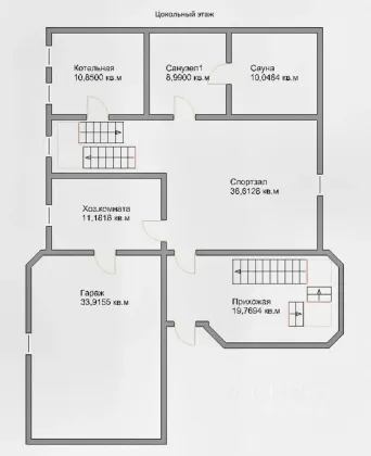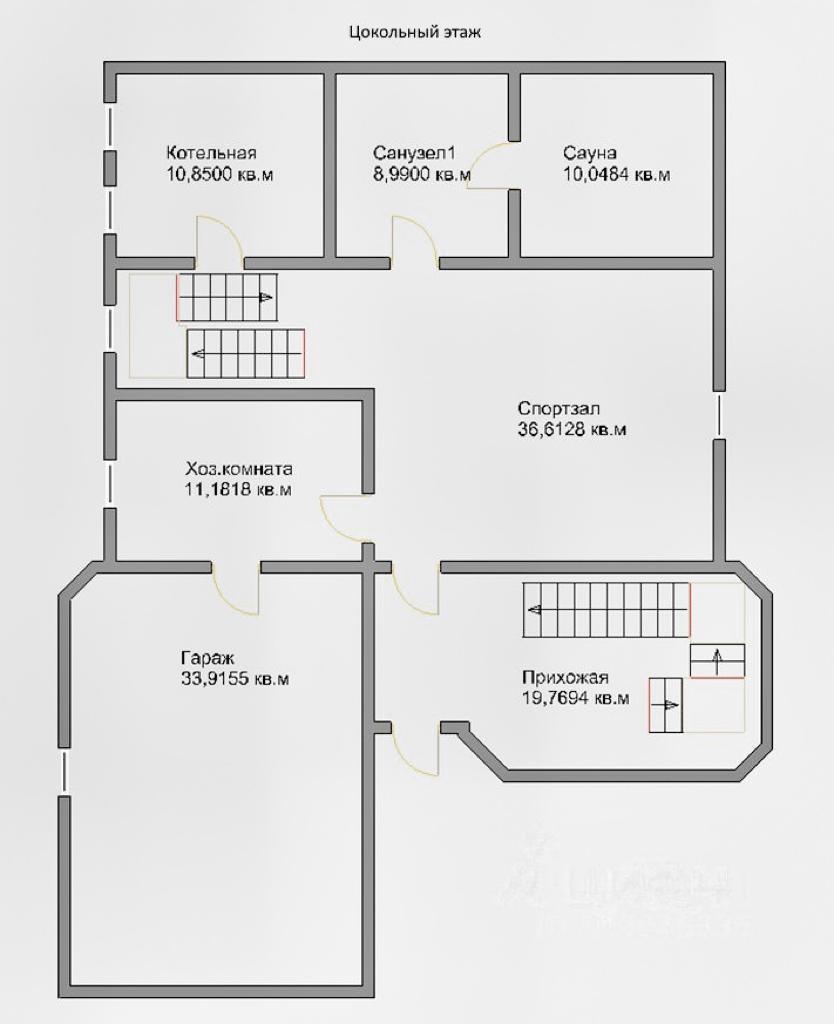 Цокольный этаж: расположен на уровне входной площадки. Высота потолка 2.40 м. В прихожей (11 кв. м) расположен гардероб и широкая лестница на 1 этаж. Спортзал (40 кв. м), котельная-бойлерная (9 кв. м), санузел (9 кв. м) с постирочной и входом в сауну (9 кв. м) и дополнительная гардеробная (9 кв. м) со входом в гараж.