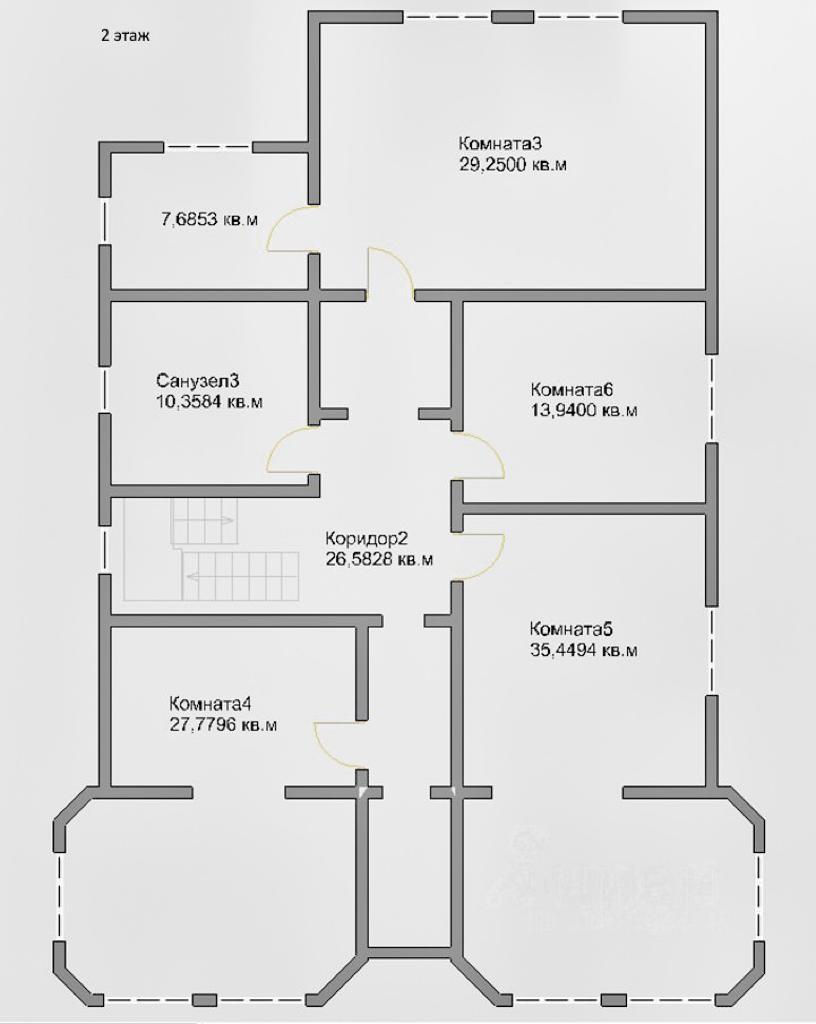 2 этаж: санузел 9 кв. м, 4 спальни 26 кв. м, 37 кв. м, 16 кв. м, и 32+6 кв. м с возможностью организации отдельного санузла.