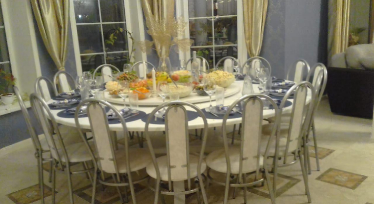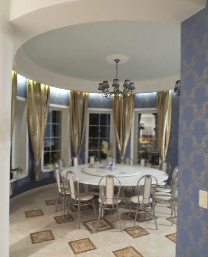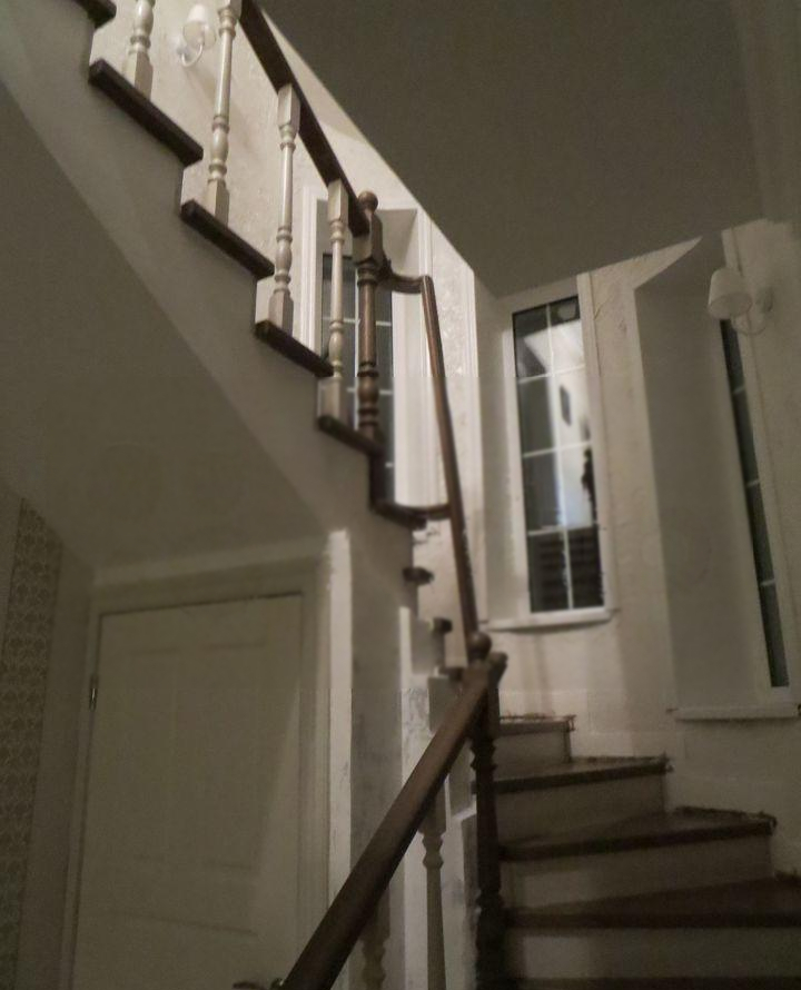 На 1 этаже: гостиная, столовая, кухня, кабинет, кладовая, санузел, холл, прихожая. В гостиной (35м) камин, 2 дивана, кресло, выход на террасу и в сад, столовая располагается в круглом эркере. Кухня: плита, посудомойка, кухонный гарнитур, раковина, обеденный стол, буфет. Санузел: душ, выложенный мозаикой, туалет, раковина, батарея отопления.