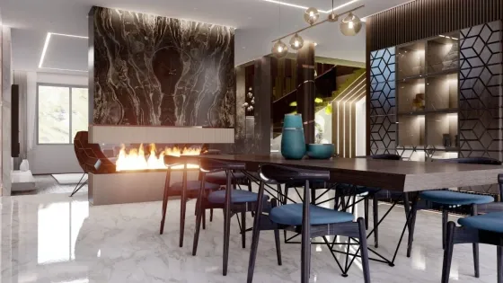 1 этаж: гардеробная при входе, гостиная с камином, кухня, столовая, санузел.