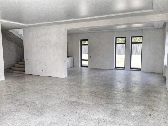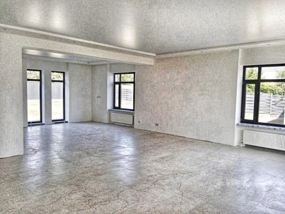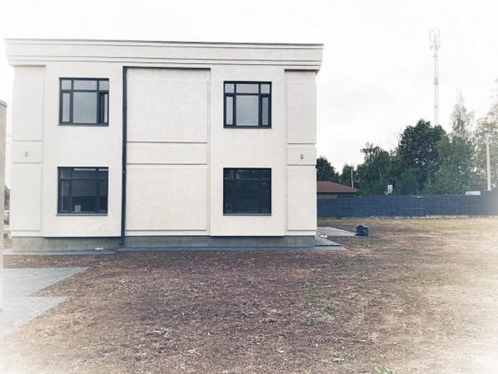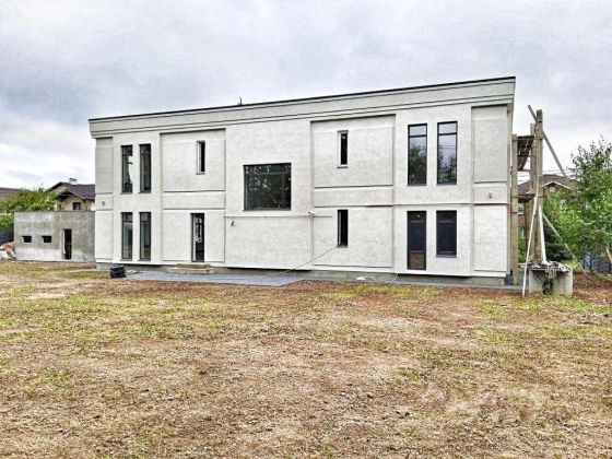 Коттедж 350 кв. м под финишную отделку в закрытом коттеджном поселке Голицыно-9. Дом 2012 года постройки из газосиликатного блока с монолитными перекрытиями, фундамент утепленная шведская плита. Высота потолков и на первом, и на втором этажах по 3 метра, ширина лестничных маршей 1,8 метра. Отделка White Box. 2 этажа.