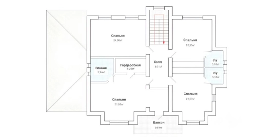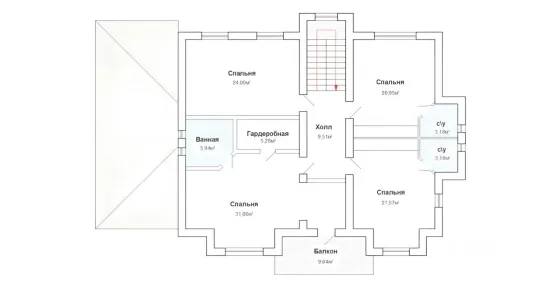 2 этаж: 4 спальни, 3 из них с санузлом, одна с ванной и гардеробной, холл, балкон.