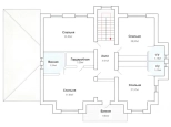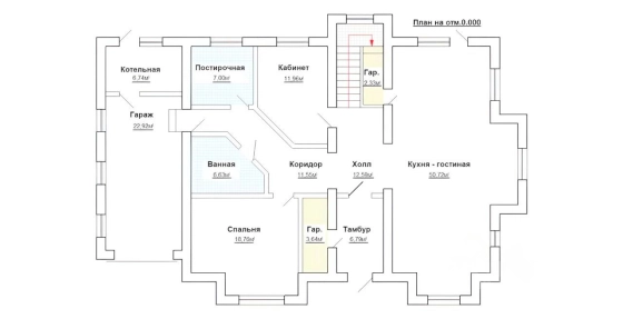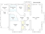 1 этаж: кухня-гостиная, холл, тамбур, 2 гардеробные, коридор, кабинет, спальня, санузел с ванной, постирочная, котельная, гараж.