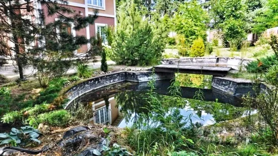 Участок 8 соток. Живописный ухоженный участок: взрослые плодовые деревья, сосны, пруд, небольшой огород, площадка для автомобиля. Кирпичный забор, солидные соседи. Поселок охраняется.
