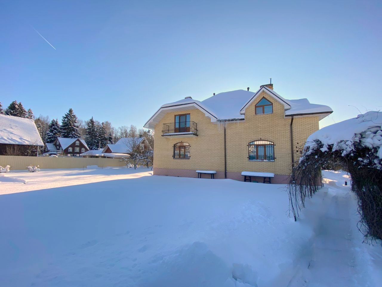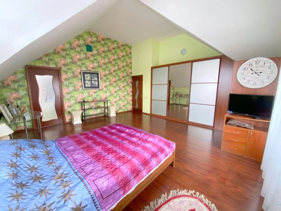 Коттедж 272 кв. м «под ключ» в солидной коттеджной застройке СНТ Искра. Дом 2006 года постройки из газобетона с монолитными перекрытиями на ленточном фундаменте, кровля - качественная гибкая черепица Katepal с тройным утеплением, окна из профиля Veka с двойным стеклопакетом, лестница - монолитная, отделана натуральным деревом. Дом меблирован и полностью готов к проживанию. 2 этажа. В доме 4 спальни, 3 с/узла.